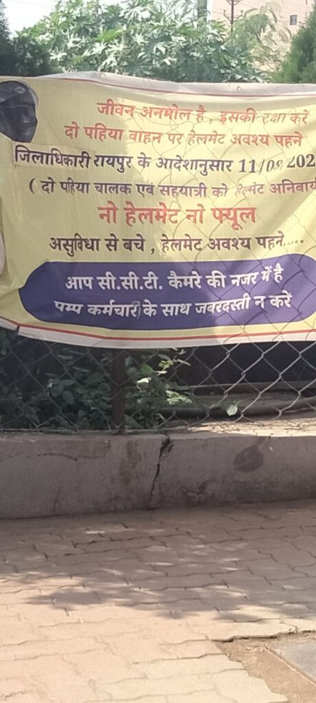 बैनर पर लिखे संदेश में कहा गया है, “जीवन अनमोल है, इसकी रक्षा करें” और “आप सी.सी.टी.वी. कैमरे की नजर में हैं।” साथ ही पम्प कर्मचारियों के साथ जबरदस्ती न करने की अपील की गई है। अब देखना होगा कि छत्तीसगढ़ में यह अभियान कितना कारगर साबित होता है और लोग हेलमेट पहनने की आदत को अपनाते हैं या नहीं।