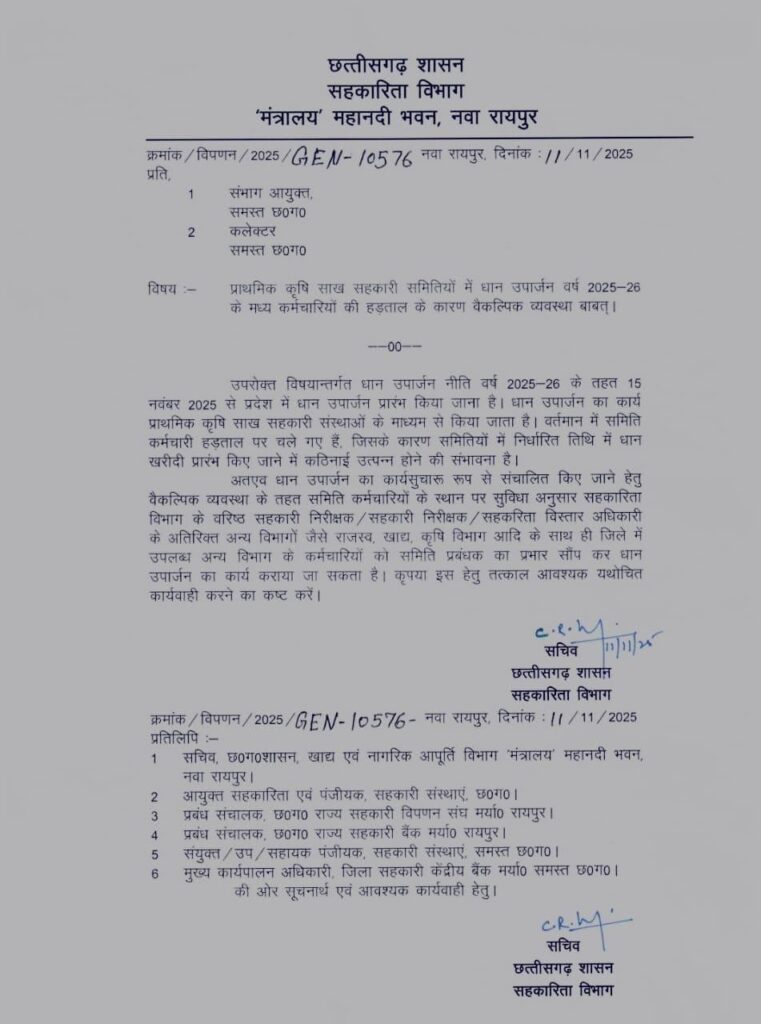 सारंगढ़ । धान उपार्जन वर्ष 2025 -26 की प्रक्रिया 15 नवम्बर से प्रदेशभर में प्रारंभ की जानी है , धान उपार्जन का कार्य प्राथमिक कृषि साख सहकारी संस्थाओं के माध्यम से किया जाता है ।वर्तमान में समिति कर्मचारी अपने चार सूत्रीय मांगों को लेकर हड़ताल पर चले गए हैं जिसके कारण समितियां में निर्धारित तिथि में धान खरीदी प्रारंभ किए जाने में कठिनाइयां उत्पन्न होने की संभावना है । कर्मचारियों के हड़ताल पर जाने से धान खरीदी कार्य में व्यवधान उत्पन्न होने की संभावना है । इस परिस्थिति को देखते हुए छग शासन के सहकारिता विभाग ने वैकल्पिक व्यवस्था लागू करने के निर्देश जारी किए हैं ।