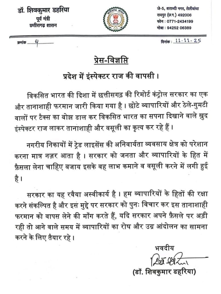 सारंगढ़ बिलाईगढ़ । विकसित भारत की दिशा में छत्तीसगढ़ की रिमोर्ट कंट्रोल सरकार का एक और तानाशाही फरमान जारी किया गया है । छोटे व्यापारियों और ठेले-गुमटी वालों पर टैक्स का बोझ डाल कर विकसित भारत का सपना दिखाने वाले ख़ुद इंस्पेक्टर राज लाकर तानाशाही और वसूली का कृत्य कर रहे हैं । उक्त बाते प्रदेश के पूर्व कैबिनेट मंत्री डॉ शिवकुमार डहरिया ने प्रेस विज्ञप्ति के माध्यम से कही, उन्होंने आगे कहा कि
