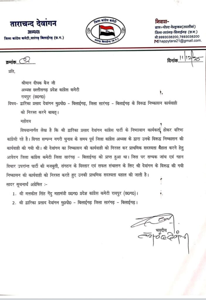 छत्तीसगढ़ प्रदेश कांग्रेस कमेटी के अध्यक्ष दीपक बैज ने इस पर सम्यक जांच एवं गहन विचार उपरांत पार्टी की मजबूती, संगठन के विस्तार एवं सफल संचालन के लिए द्वारिका देवांगन के विरुद्ध की गई निष्कासन की कार्यवाही को निरस्त कर उनकी प्राथमिक सदस्यता बहाल किया है इस अवसर पर श्री देवांगन ने अपनी इस बहाली पर प्रदेश अध्यक्ष दीपक बैज का आभार जताया है ।