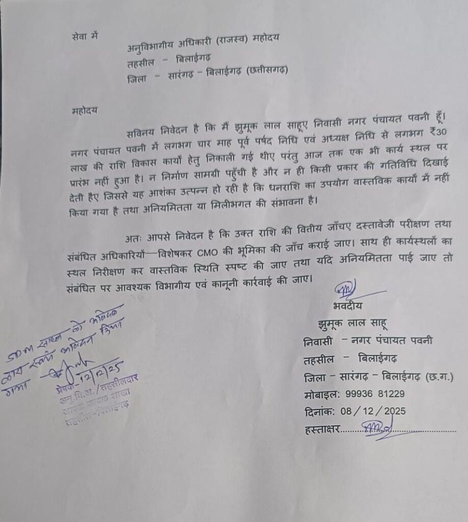 नगर पंचायत पवनी में 30 लाख रुपये की निधि पर गंभीर सवाल अनुविभागी अधिकारी बिलाईगढ़ से किया गया शिकायत