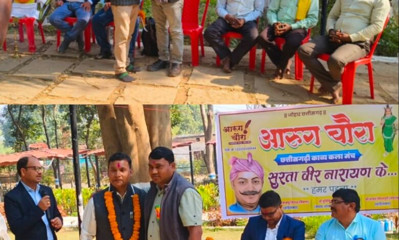 इस काव्य संगोष्ठी का भव्य आयोजन आरूग चौरा के संस्थापक ईश्वर साहू आरूग जी के, मार्गदर्शन एवं संयोजन में किया गया, जहां बेमेतरा, गुरूर, बिलाईगढ़, सारंगढ़, भाटापारा, सिमगा, बलौदाबाजार, कोलिहापदर, नवगांव कला, धमधा, शिवरीनारायण, खरौद, पथरिया आदि कई क्षेत्र के कवि व कवियत्री शामिल होकर शहीद वीर नारायण सिंह जी के जीवनी पर कविता पाठ किया