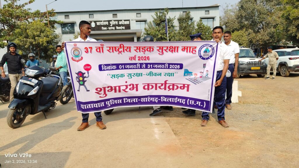 सारंगढ़। देशभर में 37वां राष्ट्रीय सड़क सुरक्षा सप्ताह 1 जनवरी से 31 जनवरी तक मनाया जा रहा है। इसी कड़ी में आज सारंगढ़–बिलाईगढ़ जिले में पुलिस प्रशासन द्वारा भारत माता चौक, सारंगढ़ में सड़क सुरक्षा सप्ताह का आयोजन किया गया। इस आयोजन का मुख्य उद्देश्य आम नागरिकों को सड़क सुरक्षा के प्रति जागरूक करना तथा यातायात नियमों के पालन को प्रोत्साहित करना है, ताकि सड़क दुर्घटनाओं और उनसे होने वाली मौतों में प्रभावी कमी लाई जा सके।