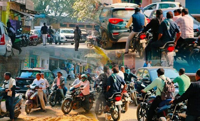 ओर दोपहिया और चारपहिया वाहन मनमाने ढंग से खड़े कर दिए जाते हैं। दुकानदार अपनी दुकानों