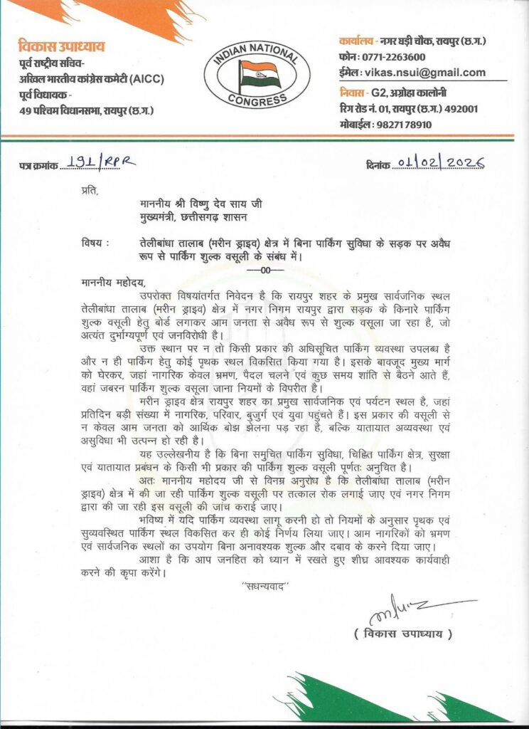 पूर्व विधायक विकास उपाध्याय ने इस गंभीर मामले को लेकर माननीय मुख्यमंत्री विष्णु देव साय, नगरीय प्रशासन मंत्री अरुण साव,सांसद बृजमोहन अग्रवाल रायपुर के विधायकों राजेश मुणत, मोतीलाल साहू, पुरंदर मिश्रा को पत्र लिखकर तत्काल हस्तक्षेप की मांग की है। पत्र के माध्यम से उन्होंने मरीन ड्राइव क्षेत्र में की जा रही पार्किंग शुल्क वसूली पर तत्काल रोक लगाने, पूरे मामले की जांच कराने तथा आम जनता को राहत देने की मांग की है।