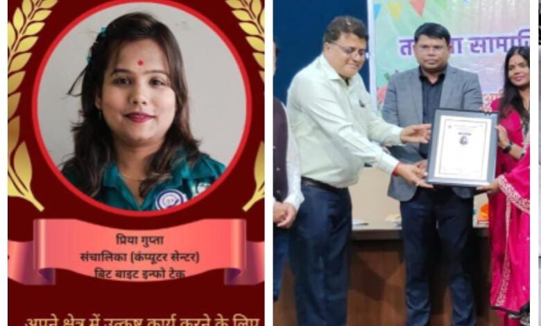रायपुर तपस्या सामाजिक सेवा संस्थान द्वारा समाज के विभिन्न क्षेत्रों में उल्लेखनीय योगदान देने वाली महिलाओं का सम्मान किया गया इसी परिपेक्ष में समाज सेवा के क्षेत्र में उत्कृष्ट योगदान देने वाली महिला प्रिया गुप्ता जो bit byte info tech कंप्युटर सेंटर संचालिका का वृंदावन हॉल सिविल लाइन में किया गया