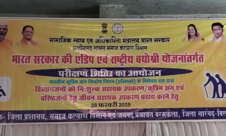 सामाजिक न्याय एवं अधिकारिता मंत्रालय, भारत सरकार की संस्था एलिम्को जबलपुर के समन्वय से समाज कल्याण विभाग द्वारा विकास खंड बरमकेला में दिव्यांगजनों एवं वरिष्ठजनों को सहायक उपकरण उपलब्ध कराने हेतु आंकलन सह परीक्षण शिविर का आयोजन आज 28 फरवरी स्थानीय मंगल भवन में किया गया।