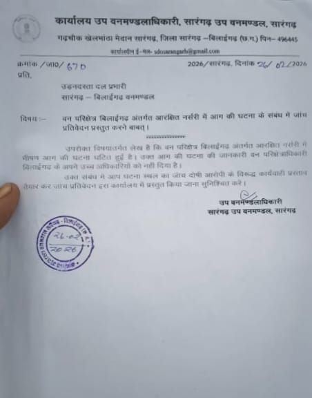 सारंगढ़-बिलाईगढ़। बिलाईगढ़ वन परिक्षेत्र अंतर्गत आरक्षित नर्सरी रेल कॉरिडोर कक्ष क्रमांक 408 में भीषण आगजनी होने की वजह से करीब 42000 पेड़ को नुकसान पहुंचा है जिसमें बड़ी संख्या में सागौन पेड़ और फलदार पेड़ शामिल हैं। उक्त खबर मिलने के बाद उप वनमंडल अधिकारी सारंगढ़ बिलाईगढ़ के द्वारा उड़नदस्ता दल प्रभारी को गुरुवार को आदेश जारी करते हुए पत्र लिखा गया है कि बिलाईगढ़ के आरक्षित नर्सरी में भी सड़क की घटना घटित हुई है उक्त आग की घटना की जानकारी वन परिक्षेत्र अधिकारी बिलाईगढ़ के द्वारा अपने उच्च अधिकारियों को नहीं दिया गया है उक्त संबंध में आप घटनास्थल पर जांच कर दोषी आरोपी के विरुद्ध कार्यवाही प्रस्ताव तैयार कर जांच प्रतिवेदन कार्यालय में प्रस्तुत करना सुनिश्चित करें । लेकिन इस आदेश का भी उल्लंघन किया गया दो दिनों तक किसी भी प्रकार की जांच कार्यवाही नहीं की गई शनिवार को उड़नदस्ता टीम बिलाईगढ़ जरूर पहुंची लेकिन वन परिक्षेत्र अधिकारी के कार्यालय में बैठकर रेंजर माखन लाल बंजारे के द्वारा बनाए गए पंचनामा को पढ़ा गया और उसी को लेकर वापस लौट गए जबकि उक्त मामले में रेंजर की भी बड़ी लापरवाही सामने आई है जो आरोपी है उन्हीं के द्वारा पंचनामा तैयार किया गया था उसी को उड़नदस्ता टीम लेकर चली गई । घटनास्थल की जांच तक करना उचित नहीं समझा गया । इस प्रकार से देखा जाए तो वन विभाग के अधिकारियों के द्वारा ही इतनी बड़ी घटना को दबाने का प्रयास किया जा रहा है।