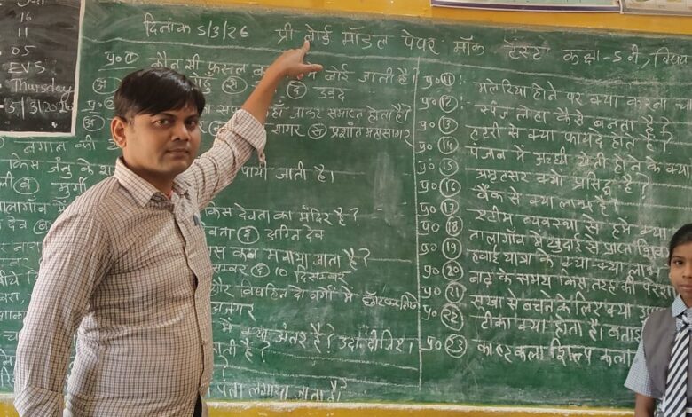 बरमकेला//प्रधान पाठक विनोद कुमार पटेल द्वारा शासकीय प्राथमिक विद्यालय सुखापाली में प्री बोर्ड मॉक टेस्ट का प्रतिदिन आयोजन किया जा रहा है। विदित हो कि छत्तीसगढ़ सरकार स्कूल शिक्षा विभाग द्वारा प्राथमिक और माध्यमिक विद्यालय सुखापाली में 16 मार्च से बोर्ड परीक्षा आयोजित किया जा रहा है। कक्षा पांचवीं बोर्ड परीक्षा हेतु पाठयपुस्तकों से आने वाले विषयों एवं अध्यायों का ब्लू प्रिंट तैयार किया गया है। ब्लू प्रिंट के आधार पर अंकों का विभाजन किया गया है। 40अंकों के होने वाले प्रश्न पत्र में 1अंक,2अंक, 3अंक एवं 4अंक के आधार पर प्रश्न पत्र निर्माण किया जाएगा।और प्रोजेक्ट कार्य हेतु 10 अंक निर्धारण किया गया है। छत्तीसगढ़ सरकार द्वारा बोर्ड परीक्षा के डर को भगाने के लिये प्राथमिक शिक्षा से ही बोर्ड परीक्षा लिया जा रहा है ताकि 10वीं, 12वी बोर्ड परीक्षा हेतु बच्चे तैयार रहे और परीक्षा का डर न लगे। बच्चों को ब्लू प्रिंट केआधार पर बार – बार मॉक टेस्ट लेने से बच्चे परीक्षा के प्रति उत्सुक रहते है और घरों में अध्ययनरत रहने हेतु प्रेरित होते हैं। मॉक टेस्ट से बच्चों में एकाग्रता क्षमता का भी विकास होता है।
