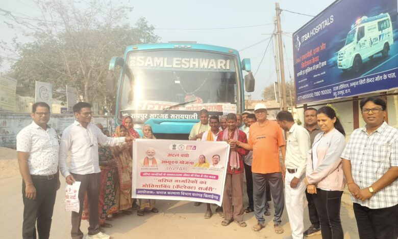 स्वास्थ्य विभाग के समन्वय से चिन्हित बुजुर्गों को समाज कल्याण विभाग सारंगढ़ द्वारा विशेष बस परिवहन की व्यवस्था करके अखिल भारतीय आयुर्विज्ञान संस्थान एम्स रायपुर ले जाया गया। जहां एम्स के चिकित्सकों आधुनिक उपचार पद्धति द्वारा सभी 10 बुजुर्गों की मोतियाबिंद कैटरेक्ट की सफल सर्जरी की गई।