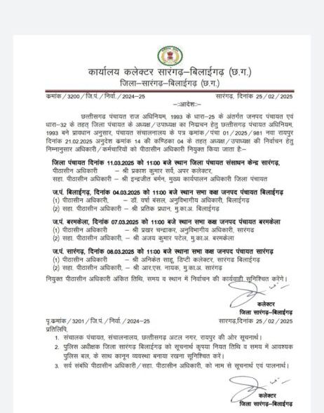 सारंगढ़ बिलाईगढ़, 1 मार्च 2025/ छत्तीसगढ़ पंचायत राज अधिनियम 1993 के धारा 25 के तहत जनपद पंचायत के अध्यक्ष और उपाध्यक्ष के निर्वाचन के लिए कलेक्टर धर्मेश कुमार साहू ने एसडीएम बिलाईगढ़ डॉ वर्षा बंसल को पीठासीन अधिकारी और सीईओ बिलाईगढ़ प्रतीक प्रधान को सहायक पीठासीन अधिकारी नियुक्त किया है। जनपद पंचायत बिलाईगढ़ के सभाकक्ष में 4 मार्च को 11 बजे से निर्वाचन की कार्यवाही संपन्न करने के लिए कलेक्टर ने अधिकारियों को आदेश जारी किए हैं।