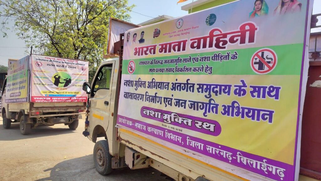 नशा मुक्ति रथ जिले के तीनों जनपद के प्रत्येक ग्राम पंचायत एवं नगरीय निकायों के क्षेत्र में जाकर लोगों को जागरूक कर रहा। विभाग के स्वयंसेवक नशा मुक्ति रथ के साथ समुदाय के बीच में जाकर प्रचार प्रसार कर नशा मुक्ति साहित्य आदि का वितरण भी कर रहे हैं । भारत माता वाहिनी योजना अंतर्गत जन जागृति हेतु दीवारों पर नारा लेखन भी कराया जा रहा है। नशे के पीड़ित व्यक्तियों के पुनर्वास एवं उपचार के लिए समाज कल्याण विभाग नशा मुक्ति केंद्र का संचालन भी जल्दी ही करने जा रहा है, जिससे गंभीर रूप से प्रभावित नशापीड़ित व्यक्तियों का उपचार तथा पुनर्वास किया जा सकेगा।