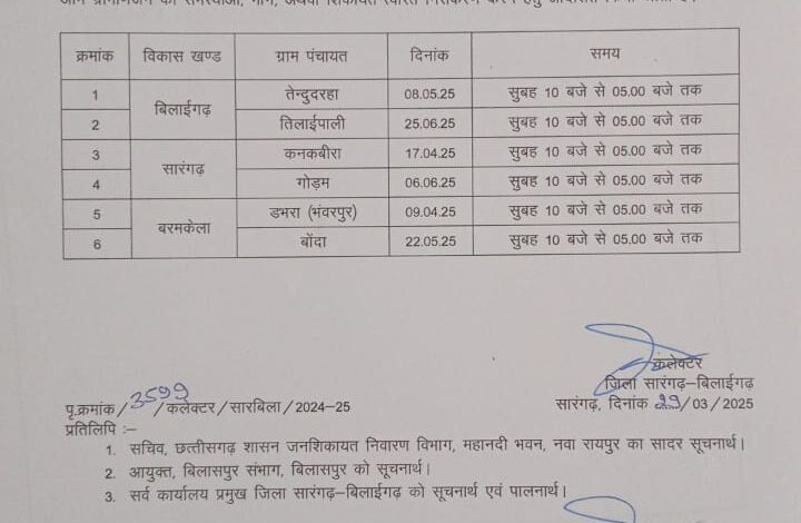कलेक्टर द्वारा जारी आदेश अनुसार 9 अप्रैल को बरमकेला ब्लॉक के ग्राम पंचायत डभरा (भंवरपुर) में, 17 अप्रैल को सारंगढ़ ब्लॉक के ग्राम पंचायत कनकबीरा में, 8 मई को बिलाईगढ़ ब्लॉक के ग्राम पंचायत तेंदुदरहा में, 22 मई को बरमकेला ब्लॉक के ग्राम पंचायत बोंदा में, 6 जून को सारंगढ़ ब्लॉक के ग्राम पंचायत गोडम में और 25 जून को बिलाईगढ़ ब्लॉक के ग्राम पंचायत तिलाईपाली में जिला स्तरीय जनसमस्या निवारण शिविर निर्धारित है।