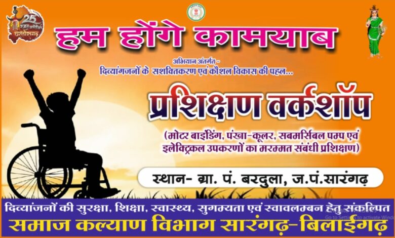 सारंगढ़ बिलाईगढ़, समाज कल्याण विभाग द्वारा दिव्यांगजनों की सुरक्षा, शिक्षा, स्वास्थ्य, सुगम्यता एवं स्वावलंबन पर आधारित अभियान “हम होंगे कामयाब” का संचालन किया जा रहा है। अभियान के अंर्तगत शुक्रवार को दिव्यांगजनों के सशक्तिकरण एवं कौशल विकास आधारित तीन दिवस तक चलने वाले प्रशिक्षण वर्कशॉप का शुभारंभ जनपद सारंगढ़ के ग्राम पंचायत बरदुला में किया गया। स्थानीय जन प्रतिनिधियों की उपस्थिति में प्रशिक्षण कार्यक्रम का शुभारंभ सर्वप्रथम भारत माता की प्रतिमा पर माल्यार्पण एवं पुष्प अर्पण के साथ किया गया। इसके बाद सभी उपस्थित दिव्यांगजनों का परिचय कराया गया। प्रशिक्षण कार्यक्रम में जनपद पंचायत सारंगढ़ के 10 ग्राम पंचायतों के लगभग 18 दिव्यांगजन मोटर वाइंडिंग और इलेक्ट्रिक उपकरणों के मरम्मत का कौशल विकास संबंधी प्रशिक्षण प्राप्त कर रहे है।