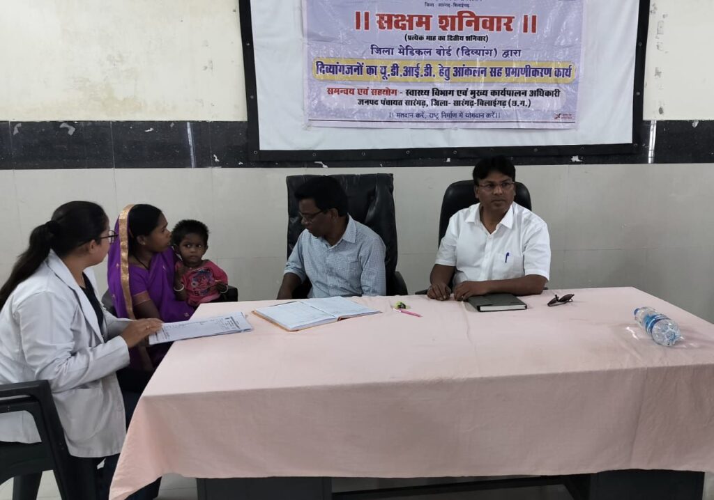 सुशासन तिहार के अवसर पर समाज कल्याण विभाग द्वारा स्वास्थ्य विभाग के साथ आज दिनांक 12 अप्रेल 2025 को सामुदायिक स्वास्थ्य केंद्र सारंगढ़ में दिव्यांगजन विशिष्ट पहचान पत्र UDID हेतु प्रमाणीकरण एवं दिव्यांगजनों के सामान्य दिव्यांगता परीक्षण के लिए माह के दूसरे शनिवार “सक्षम शनिवार” की थीम पर जिला मेडिकल बोर्ड द्वारा आंकलन शिविर का आयोजन किया गया ।