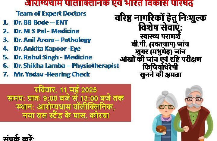 आरोग्यधाम पाली क्लीनिक और भारत विकास परिषद की कोरबा इकाई द्वारा 11 मई दिन रविवार को सुबह 9:00 बजे से दोपहर 1:00 तक आरोग्यधाम पाली क्लीनिक नया बस स्टैंड कोरबा में निशुल्क स्वास्थ्य शिविर में वरिष्ठ नागरिकों का बीपी ,शुगर ,आंख और श्रवण शक्ति की जांच कराई जाएगी। फिजियोथैरेपी के जरिए रोग मुक्त होने का उपाय भी बताया जाएगा।