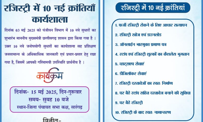 सारंगढ़ बिलाईगढ़, 14 मई 2025/उप पंजीयक सारंगढ़ के तत्वाधान में, रजिस्ट्री कानून के सुविधाजनक 10 नए बदलाव को आम जनता तक पहुंचाने के लिए कार्यशाला सह प्रशिक्षण का आयोजन सारंगढ़ के जिला पंचायत सभाकक्ष में 15 मई को सुबह 10 बजे किया जाएगा। उल्लेखनीय है कि पंजीयन अधिनियम 1908 की 35 धाराओं में संशोधन किया है।
