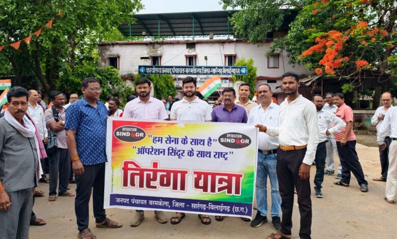 सारंगढ़ बिलाईगढ़, 17 मई 2025/जिले के जनपद पंचायत बरमकेला के तत्वावधान में भारतीय सेना के सम्मान में एक भव्य तिरंगा रैली का आयोजन किया गया। इस तिरंगा रैली में जनपद पंचायत, तहसील कार्यालय, नगर पंचायत, कृषि विभाग, पटवारी, मनरेगा,सहित अन्य विभाग व जनप्रतिनिधि और स्थानीय नागरिक रैली में शामिल हुए। मुख्य कार्यपालन अधिकारी अजय पटेल के नेतृत्व में निकली इस रैली में सैकड़ों लोगों ने हिस्सा लिया। सभी प्रतिभागियो के हाथों में तिरंगा था।