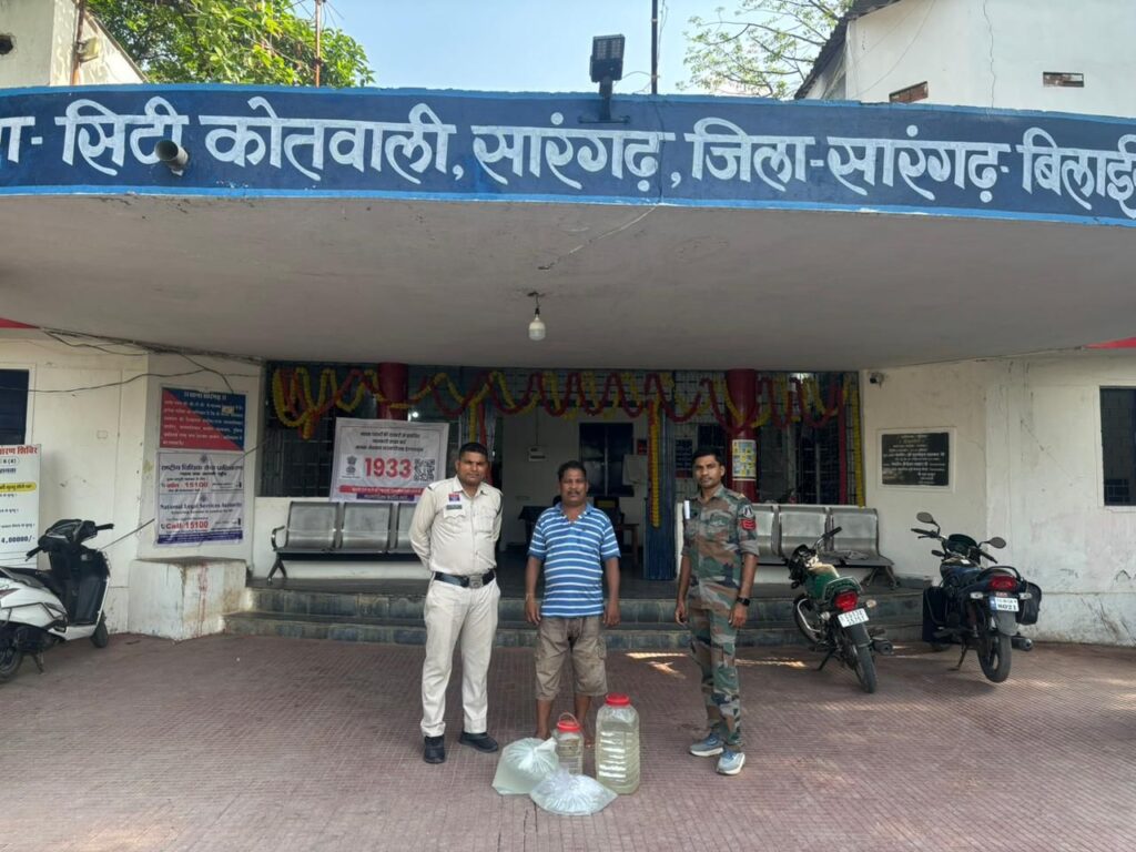 सारंगढ़ । पुलिस अधीक्षक आँजनेय वैष्णव , अति0 पुलिस अधीक्षक श्रीमती निमिषा पाण्डेय एवं एसडीओपी श्रीमती स्नेहिल साहू के द्वारा अवैध शराब बिक्री पर रोकथाम हेतु लगातार निर्देशित किये जाने पर सारंगढ़ बिलाईगढ़ पुलिस की सयुंक्त टीम द्वारा अवैध शराब बिक्री करने वाले व्यक्तियों के विरुद्ध कार्यवाही की गई। अप0क्रं0 227/ 25 धारा 34(2) 59(क) आ. एक्ट में 20 मई 25 को जरिये मुखबिर सूचना मिला कि – कमलानगर सारंगढ़ में एक व्यक्ति अपने घर के परछी में अवैध शराब बिक्री हेतु छिपा कर रखा है सूचना पर हमराह स्टाफ एवं गवाहान के घटना स्थल कमलानगर सारंगढ़ जाकर घेराबंदी कर रेड कार्यवाही किया । एक व्यक्ति घर में उपस्थित मिला जिसमे शिव सिदार पिता मनबोध सिदार उम्र 50 वर्ष सा. कमलानगर के पास से कुल 30 लीटर कच्ची महुआ शराब कीमती- 6000 रू. को मुताबिक जप्ति पत्रक के जप्तकर कब्जा पुलिस लिया गया ।बाद आरोपी को विधिवत गिरफ्तार कर न्यायिक रिमाण्ड पर जेल भेजा गया ।