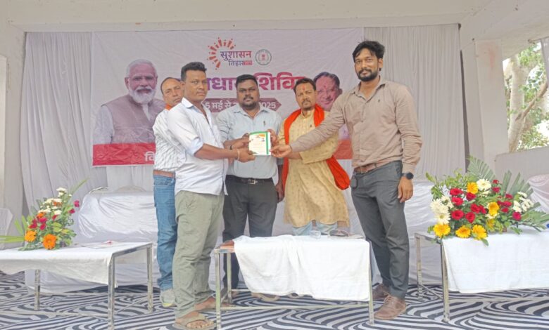 सारंगढ़। जिला कलेक्टर डॉ. संजय कन्नौजे के आदेश पर नगर पालिका के द्वारा नगर के रंगमंच में सुशासन तिहार का आयोजन किया गया ।जिस कार्यक्रम में लोगों के विभिन्न समस्याओं का समाधान भाजपा नेताओं की गरिमामय उपस्थिति में की गई । छग के मुख्यमंत्री विष्णु देव साय का सुशासन तिहार में भाजपा नेता प्रहलाद आदित्य के द्वारा नए राशन कार्ड मौके पर बनवाकर वितरित कराया गया । इसके साथ ही साथ आमजन के विभिन्न समस्याओं का समाधान सुशासन तिहार में किया गया । कार्यक्रम के प्रभारी अधिकारी के रूप में तहसीलदार मनीष सूर्यवंशी और एसडीओ पीडब्ल्यूडी कुमार साहब उपस्थित रहे ।