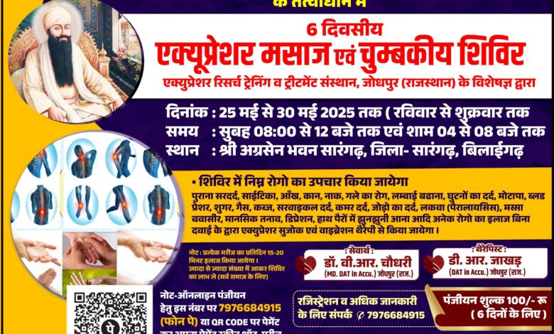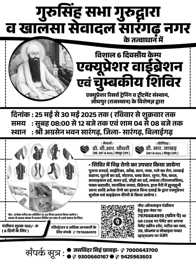 सारंगढ़ भाजपा अल्पसंख्यक मोर्चा सारंगढ़ के अध्यक्ष और खालसा सेवा दल सारंगढ़ के अध्यक्ष युवा नेता सरदार जसविंदर सिंह ने बताया कि 25 मई 2025 को एक्यूप्रेशर वाइब्रेशन व चुम्बकीय शिविर का आयोजन सारंगढ़ नगर किया जाएगा जिसमें विभिन्न रोगों के निदान के संबंध में विशेषज्ञों द्वारा जानकारी दी जाएगी साथ ही विशेष चिकित्सा पद्धति से उपचार भी किया जाएगा ।