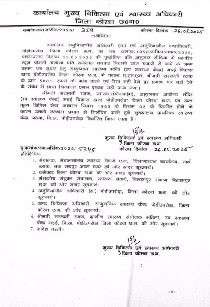 500 रुपए रिश्वत मांगने वाली ANM सरस्वती रजक सस्पेंड