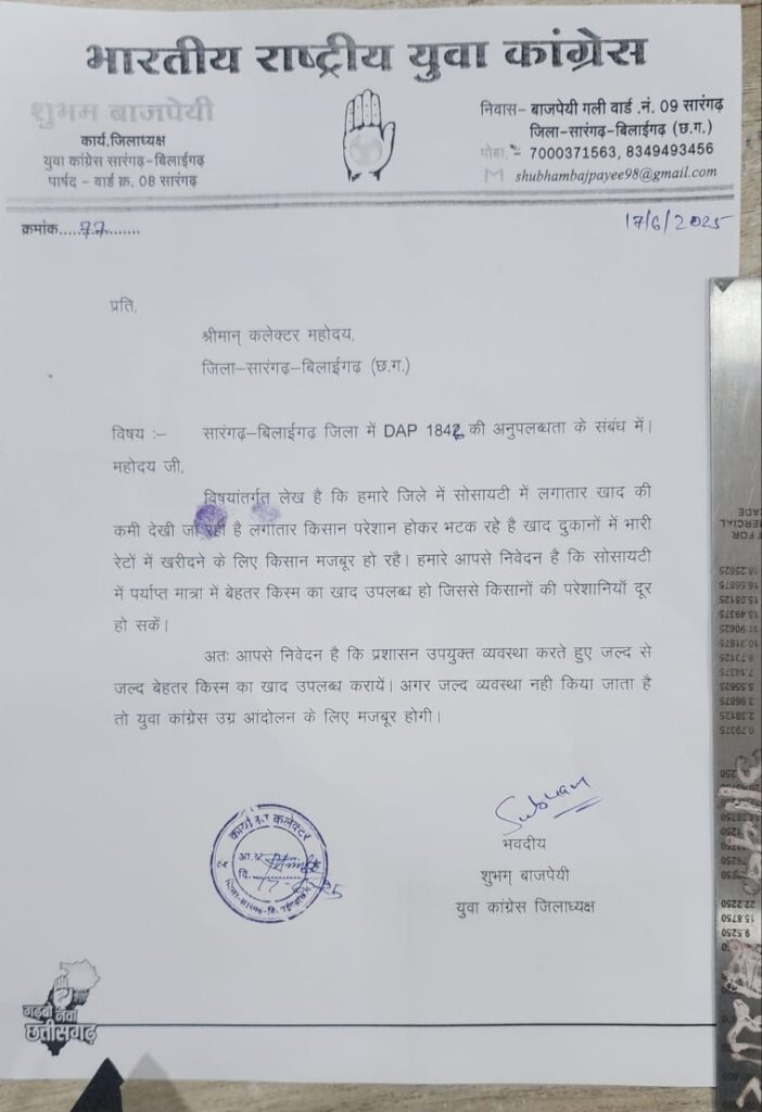 सारंगढ़। जिले में लगातार बनी खाद की कमी को लेकर किसानों में भारी असंतोष देखा जा रहा है। इसी मुद्दे को लेकर युवा कांग्रेस जिलाध्यक्ष शुभम बाजपेयी ने मंगलवार को कलेक्टर को ज्ञापन सौंपते हुए शीघ्र समाधान की मांग की।