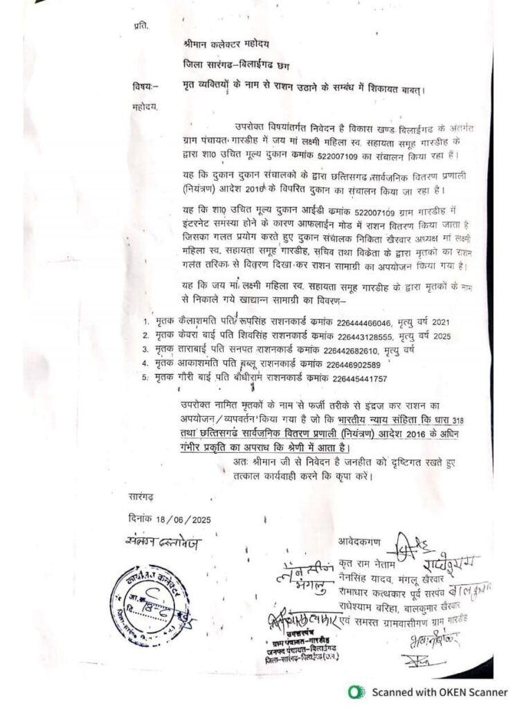 यह कि – जय मां लक्ष्मी महिला स्व. सहायता समूह गारडीह के द्वारा मृतकों के नाम से निकाले गये खाद्यान्न सामाग्री का विवरण मृतक कैलाशमती पति रूप सिंह राशनकार्ड कमांक 22644 4466046, मृत्यु वर्ष 2021, मृतक केवराबाई पति शिवसिंह राशनकार्ड कमांक 226443128555, मृत्यु वर्ष 25, मृतक ताराबाई पति सनपत राशनकार्ड क्र. 226442682610 मृत्यु , मृतक आकाशमती पति हबब्लू राशनकार्ड कमांक 226446902589, मृतक गौरी बाई पति बौधीराम कार्ड कमांक 226445441757 1 उपरोक्त नामित मृतकों के नाम फर्जी तरीके से इंद्राज कर राशन का अपयोजन / व्यपवर्तन किया गया है जो की भा. न्याय संहिता कि – धारा 318 तथा छग सार्व. वितरण प्रणाली (नियंत्रण) आदेश 2016 के अधिन गंभीर प्रकृति का अपराध की श्रेणी में आता है । जनहित को ध्यान रखते हुए तत्काल कार्यवाही करने की कृपा करें।