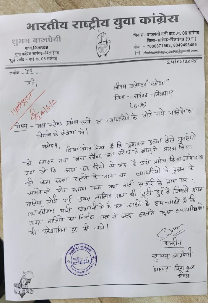 ज्ञापन में सारंगढ़ के नए बस स्टैंड को अतिशीघ्र चालू किए जाने की भी मांग की गई है। उन्होंने कहा कि लंबे समय से तैयार बस स्टैंड उपयोग में नहीं लाया जा रहा है, जिससे यात्रियों को असुविधा हो रही है और पुराने बस स्टैंड क्षेत्र में यातायात अव्यवस्थित हो गया है।