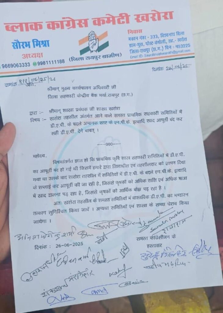 *खरोरा ब्लॉक कांग्रेस ने DAP की तत्काल आपूर्ति के लिए दिया ज्ञापन