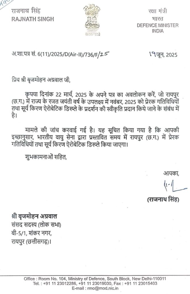 *सांसद बृजमोहन अग्रवाल की पहल पर रक्षा मंत्री ने दी सूर्य किरण एरोबेटिक डिस्प्ले की स्वीकृति*