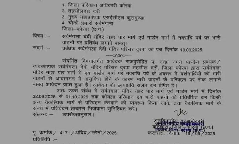 कोरबा: नवरात्रि में सर्वमंगला नहर मार्ग पर 1 अक्टूबर तक भारी वाहनों पर रोक, 35 साल बाद 10 दिन की नवरात्रि