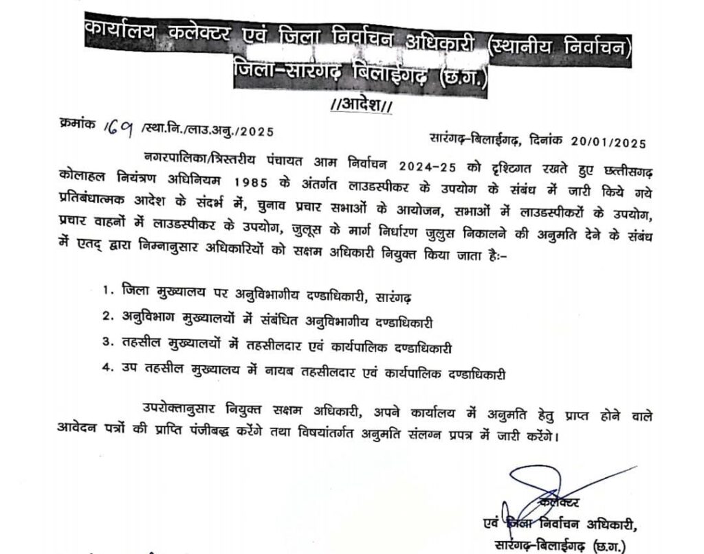 सारंगढ़ बिलाईगढ़, 6 फरवरी 2025/नगरपालिका और त्रिस्तरीय पंचायत आम निर्वाचन 2024-25 को दृष्टिगत रखते हुए कलेक्टर एवं जिला निर्वाचन अधिकारी धर्मेश कुमार साहू ने छत्तीसगढ़ कोलाहल नियंत्रण अधिनियम 1985 के अंतर्गत लाउडस्पीकर के उपयोग के संबंध में आदेश जारी किया है। इस आदेश में, चुनाव प्रचार सभाओं के आयोजन, सभाओं में लाउडस्पीकरों के उपयोग, प्रचार वाहनों में लाउडस्पीकर के उपयोग, जुलूस के मार्ग निर्धारण जुलुस निकालने की अनुमति देने के संबंध में राजस्व अधिकारियों को सक्षम अधिकारी नियुक्त किया है। इसके अनुसार जिला मुख्यालय सारंगढ़ के लिए अनुविभागीय दण्डाधिकारी सारंगढ़, अनुविभाग सारंगढ़ और बिलाईगढ़ मुख्यालयों में संबंधित अनुविभागीय दण्डाधिकारी, तहसील मुख्यालयों में तहसीलदार एवं कार्यपालिक दण्डाधिकारी और उप तहसील मुख्यालय में नायब तहसीलदार एवं कार्यपालिक दण्डाधिकारी नियुक्त किए गए हैं। इन नियुक्त सक्षम अधिकारी, अपने कार्यालय में प्रत्याशी या पार्टी द्वारा अनुमति हेतु प्राप्त होने वाले आवेदन पत्रों की प्राप्ति पंजीबद्ध करेंगे तथा नियमानुसार निर्धारित प्रपत्र में अनुमति जारी करेंगे।