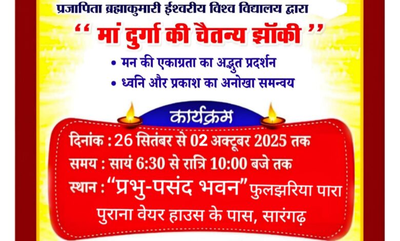 सारंगढ़। नवरात्रि के पावन पर्व पर प्रजापिता ब्रह्माकुमारी ईश्वरीय विश्व विद्यालय, सारंगढ़ के द्वारा “माँ दुर्गा की चैतन्य झाँकी” का भव्य आयोजन किया जा रहा है। यह विशेष आयोजन दिनांक 26 सितंबर से 2 अक्टूबर 2025 तक प्रतिदिन सायं 6:30 बजे से रात्रि 10:00 बजे तक “प्रभु-पसंद भवन”, फुलझरिया पारा, पुराना वेयर हाउस के पास, सारंगढ़ में आयोजित किया जाएगा।